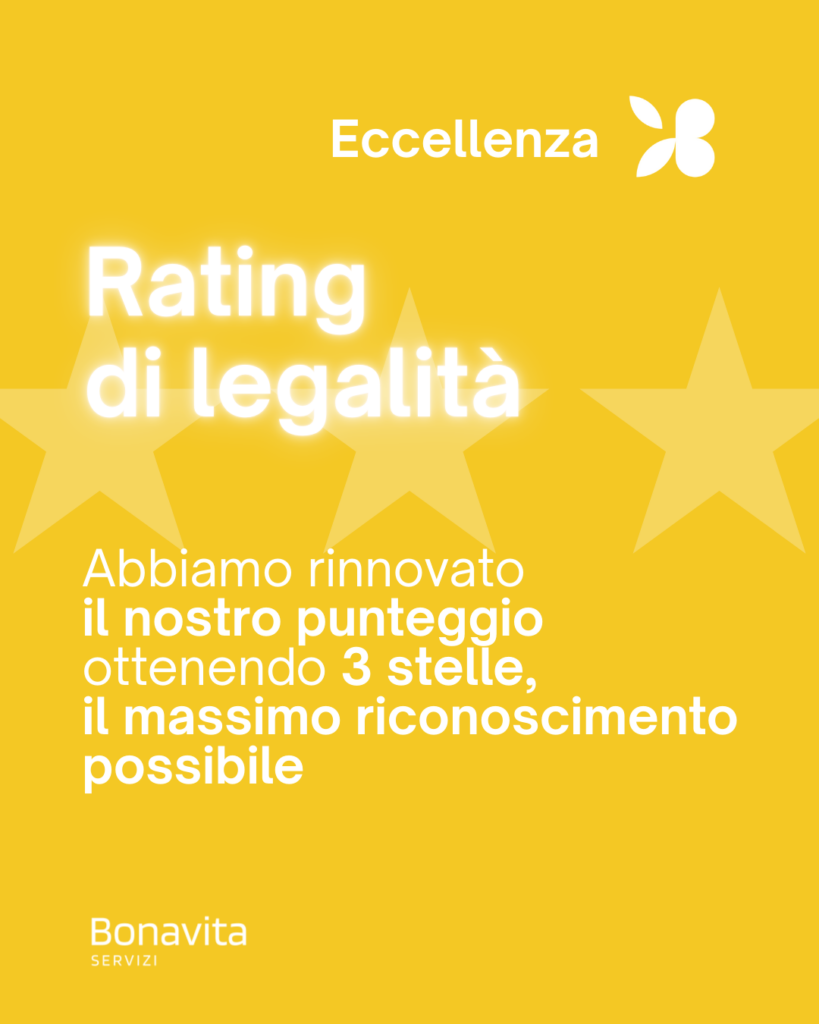 Siamo orgogliosi di annunciare il rinnovo del nostro Rating di Legalità con il punteggio di 3 stelle. Ottenere il massimo riconoscimento possibile non è solo un fregio burocratico, ma la conferma del nostro impegno contro l’illegalità e della correttezza dei nostri modelli di gestione del business. Per i nostri partner, questo significa affidarsi a una realtà solida e trasparente.